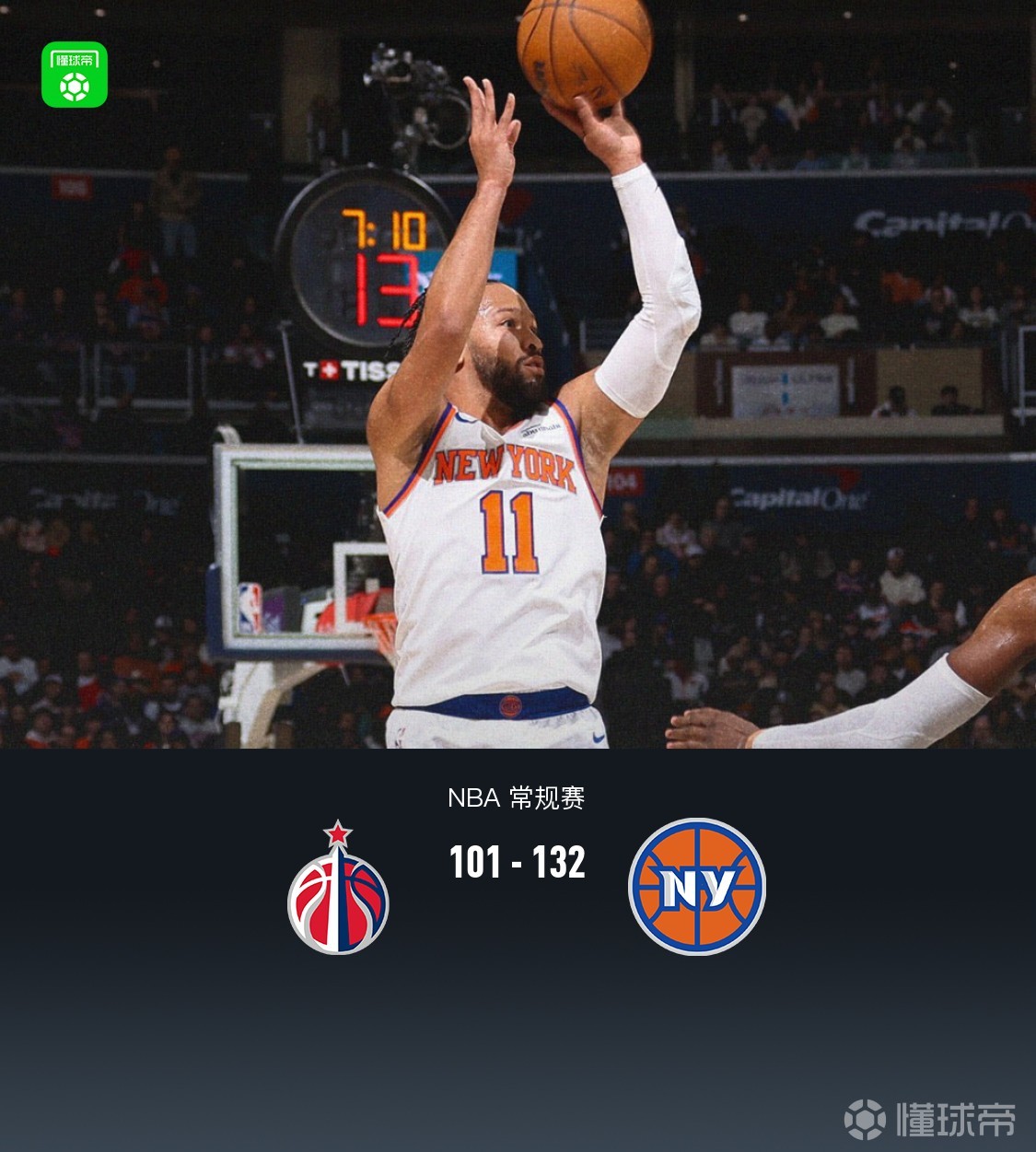 尼克斯132-101轻取奇才取7连胜,布里奇斯23+4+5,布伦森21分