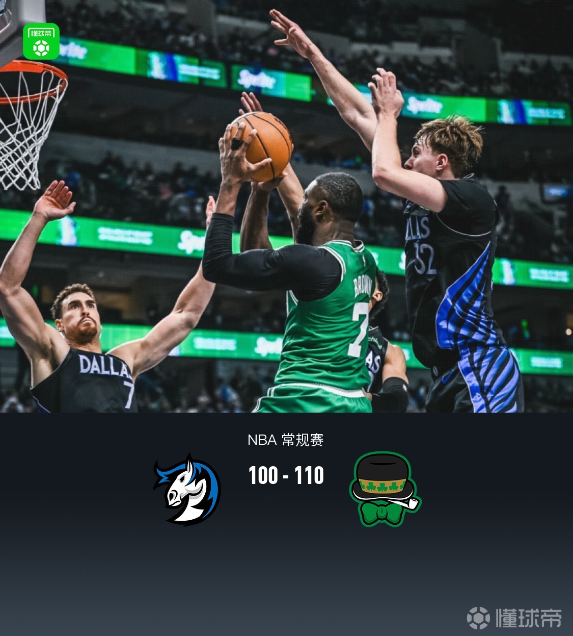 第四节独行侠弗拉格拿下15分,凯尔特人普里查德拿下9分,最终独行侠100-110不敌凯尔特人