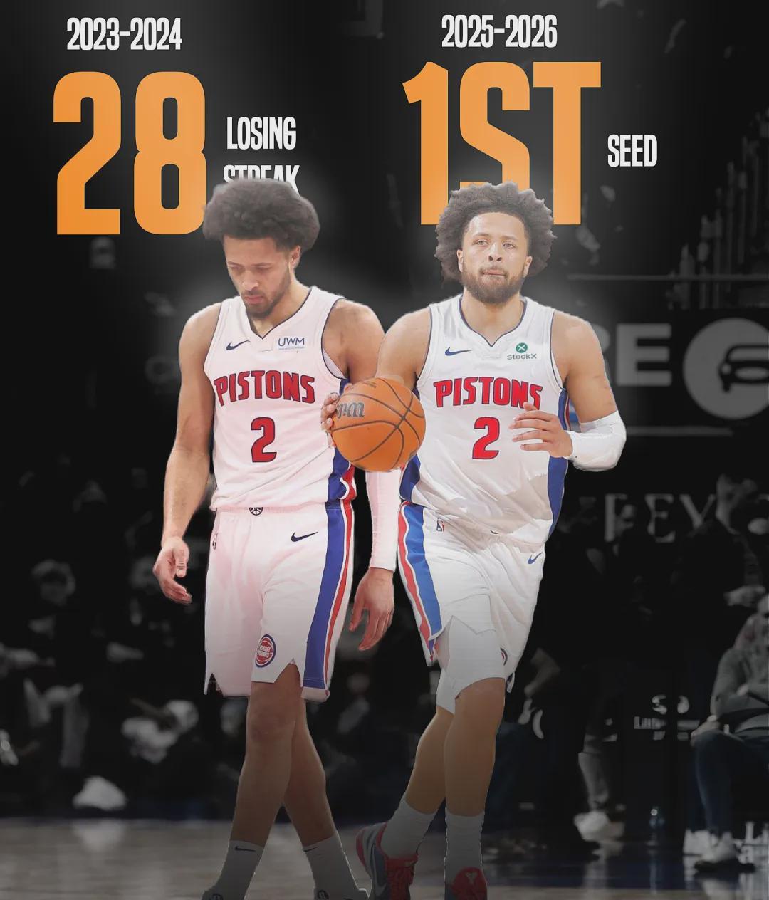 两年前的今天,活塞战绩是8胜46负,现在是40胜13负,NBA真的变天了。活塞本赛季进攻效率联盟第10,防守效率联盟第2,场均抢断和盖帽都是联盟第1。活塞最大问题是外线投射:三分命中率联盟第21,三分命中数联盟第28。