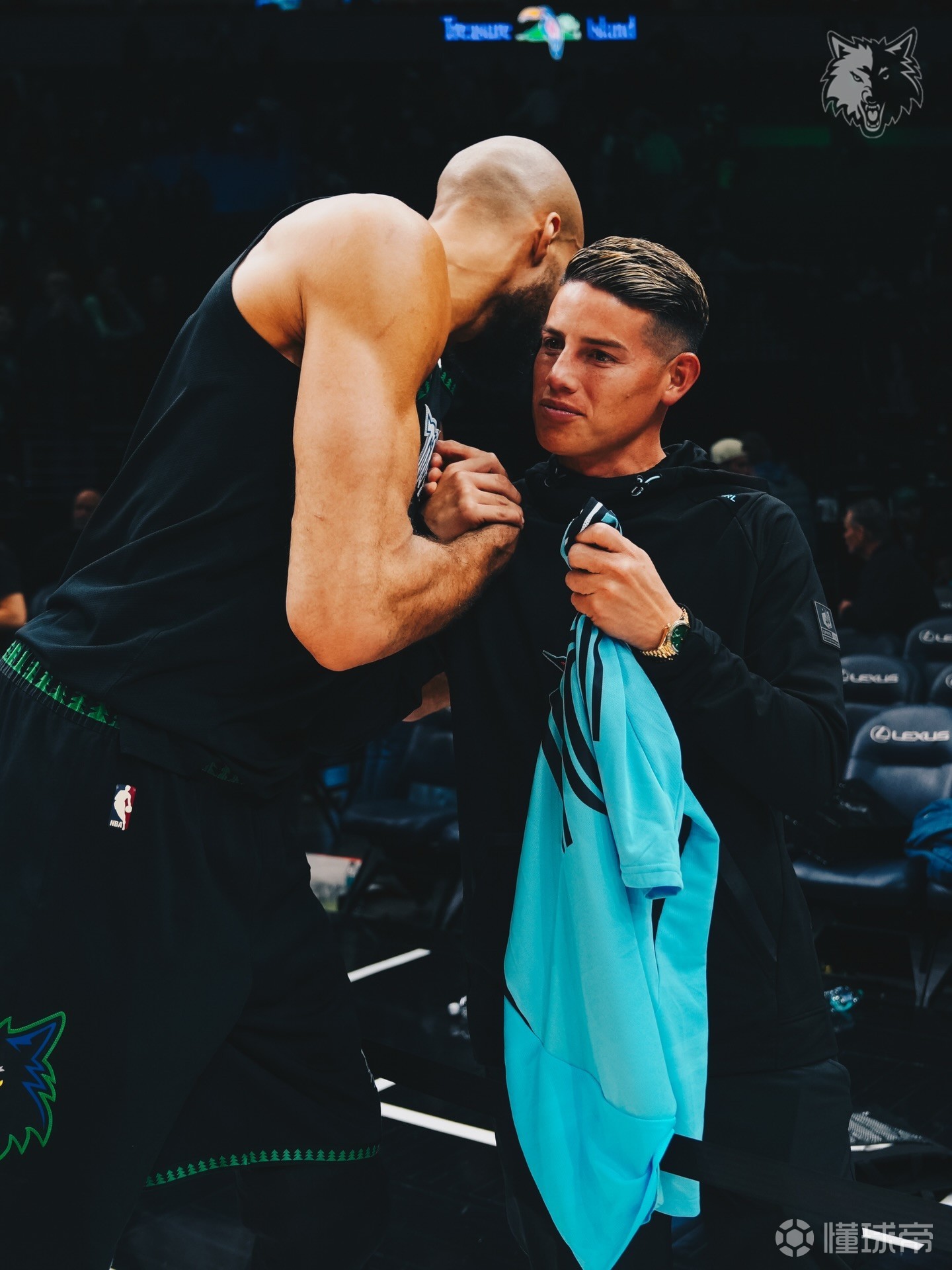 赛后,J罗与森林狼中锋戈贝尔合影留念,并送上明尼苏达联10号球衣,也获得了戈贝尔赠送的签名球衣。