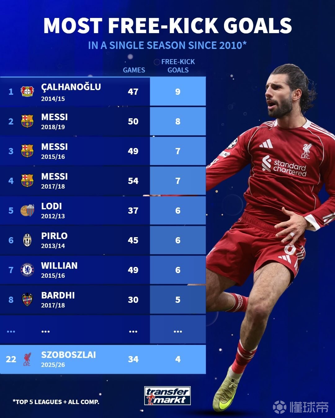 在周一凌晨进行的英超第25轮比赛中,利物浦主场1-2不敌曼城,其中索博斯洛伊打进了一记直接任意球,2月10日,德国转会市场列出了2010年以来单赛季直接任意球进球最多的球员榜。