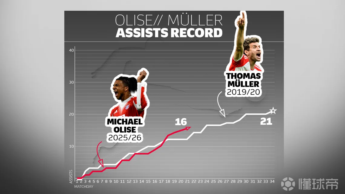 凯恩本赛季至今已打入24球。那个令人难忘的2020/21赛季,莱万在德甲第21轮战罢时已打入25球,仅比如今的凯恩多1球。奥利塞本赛季助攻数已达16次。托马斯・穆勒在2019/20赛季创下的单赛季21次助攻的德甲纪录,如今已岌岌可危。最后,截至第21轮,拜仁已轰入79球,场均进球数高达3.76粒,这一数据也创下了德甲联赛同期进球数的历史新高。德甲单赛季进球纪录同样由拜仁保持,1971/72赛季拜仁共打入101球,如今拜仁只需在剩余13轮再进23球就能刷新这一纪录,以当前的进攻状态,这一目标似乎唾手可得。